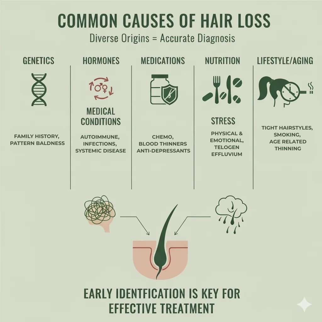 If hair loss runs in your family, you may be genetically predisposed. - Hormonal Changes: Fluctuations during puberty, pregnancy, childbirth, menopause, or conditions like thyroid disorders and Polycystic Ovary Syndrome (PCOS) can significantly disrupt the hair growth cycle.