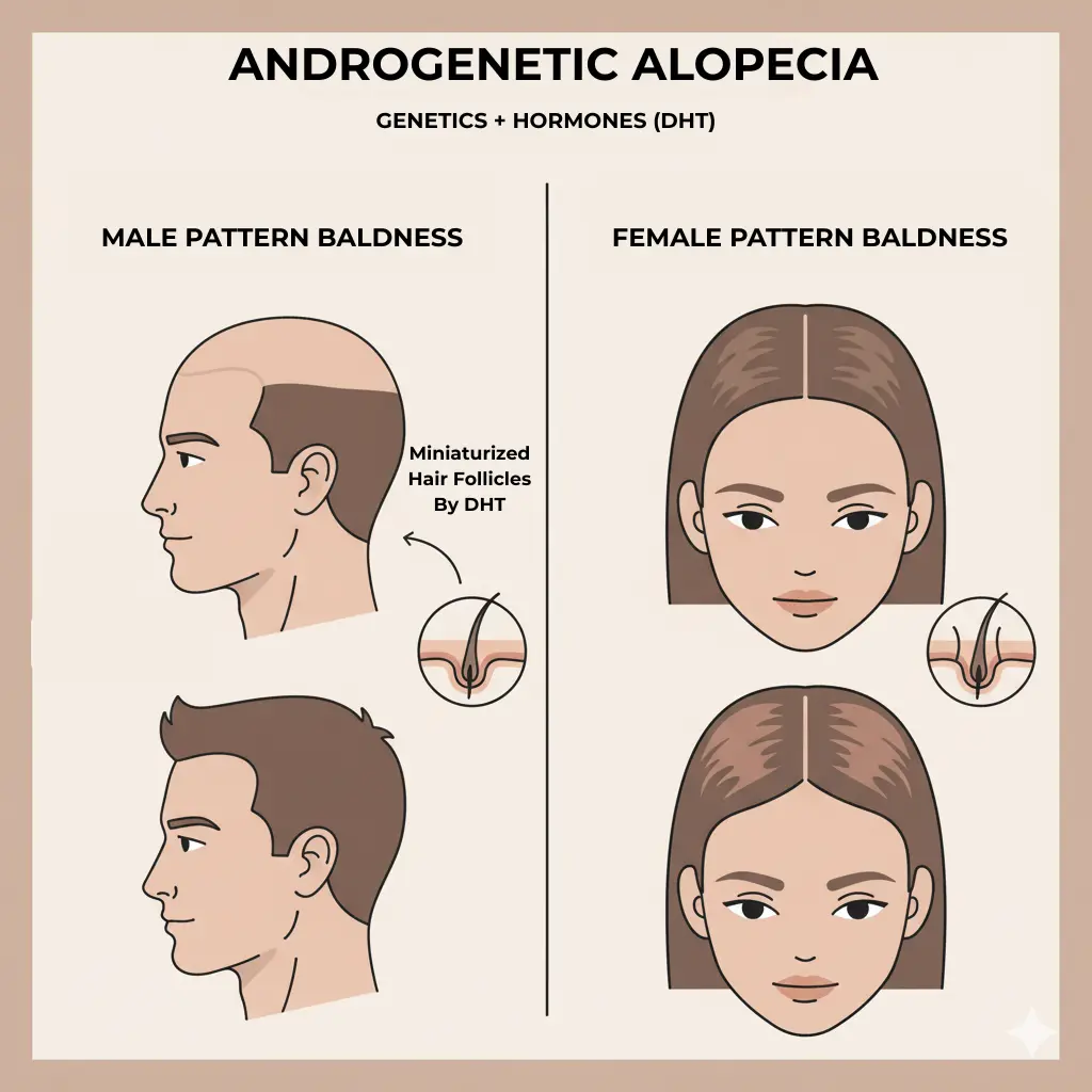 - Genetics (Predisposition to Hair Loss): The most common factor, particularly for Androgenetic Alopecia (pattern baldness).