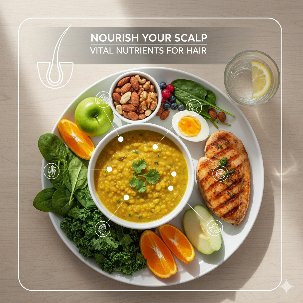 - Nourish Your Scalp with a Balanced Diet: Consume a diet rich in proteins (dal, eggs, meat), essential vitamins, and minerals (leafy greens, nuts, fruits) to provide vital nutrients to your hair follicles.