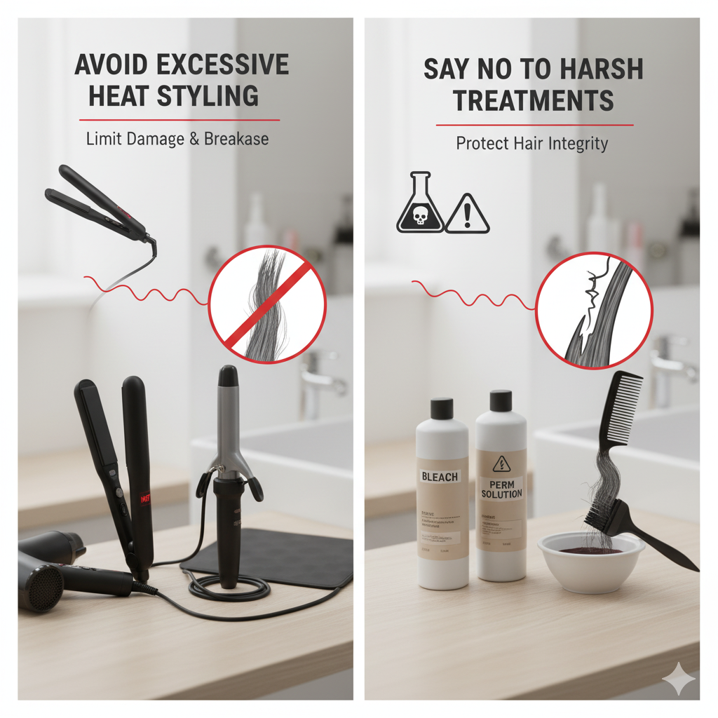 - Avoid Excessive Heat Styling & Harsh Treatments: Limit the use of heating tools (straighteners, curling irons) and aggressive chemical treatments, as they can weaken hair strands and increase breakage.