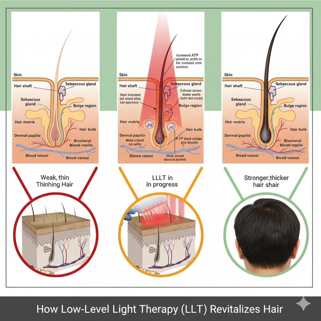 In simpler terms, LLLT gently wakes up tired follicles, feeds them better, and encourages them to stay in their growth phase longer, resulting in stronger, thicker hair.”